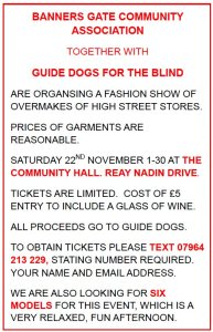 Banners Gate Community Association / Guide Dogs for the blind – Fashion Show – 22nd November at Community Hall, Reay Nadin Drive B73 6UR Share this: Click to share on X (Opens in new window) X Click to share on Facebook (Opens in new window) Facebook Like Loading... Related Author: Gatepost, Forum Newsletter. Chair, Banners Gate Neighbourhood Forum. View all posts by Gatepost, Forum Newsletter.
